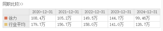 这几年,徐力作为董事长,薪酬处于下滑状态。2022年-2024年,其获取薪酬分别为149.5万元、144.7万元、99.46万元。